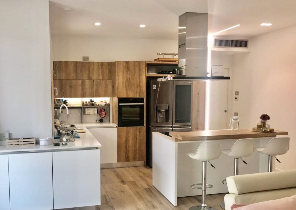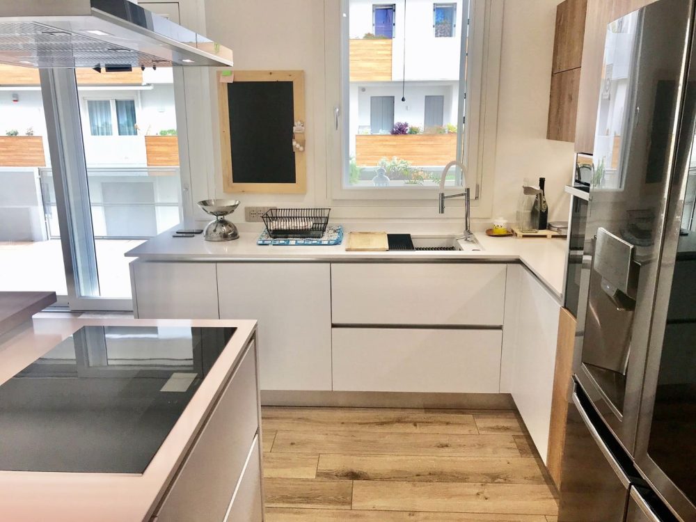 The kitchen takes up its own space thanks to the careful design, which allowed us to create an island that perfectly serves as working area for cooking and entertaining guests. The kitchen decor was brightened by white colors combined with steel and wooden details.