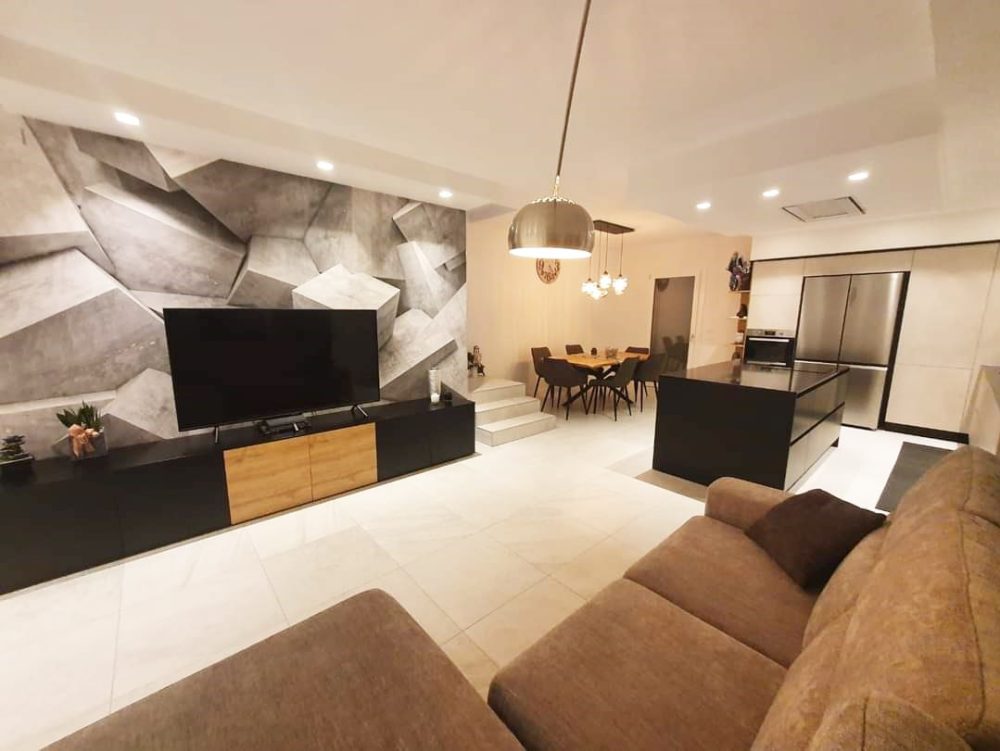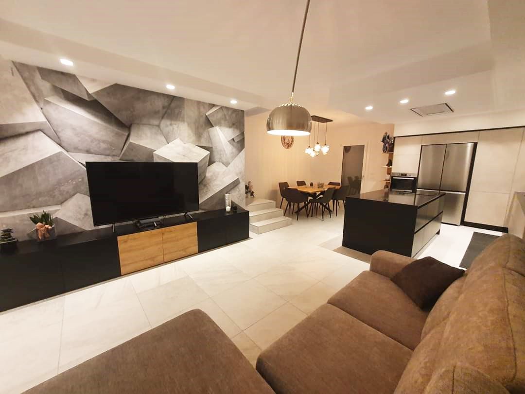 The client was completely carried away by the vision of our interior designer. Just one request: “a warm environment, to be enjoyed every day in a stylish and bold context.” Mission accomplished. The project involved furniture design, decoration, and light effects achieved with architectural elements and lighting. For the interior design we relied on geometries combined with “warm” materials and relaxing soft colors on the wood grain. The floor, together with the ceiling elements and lights, created a unique stage for the wallpaper.