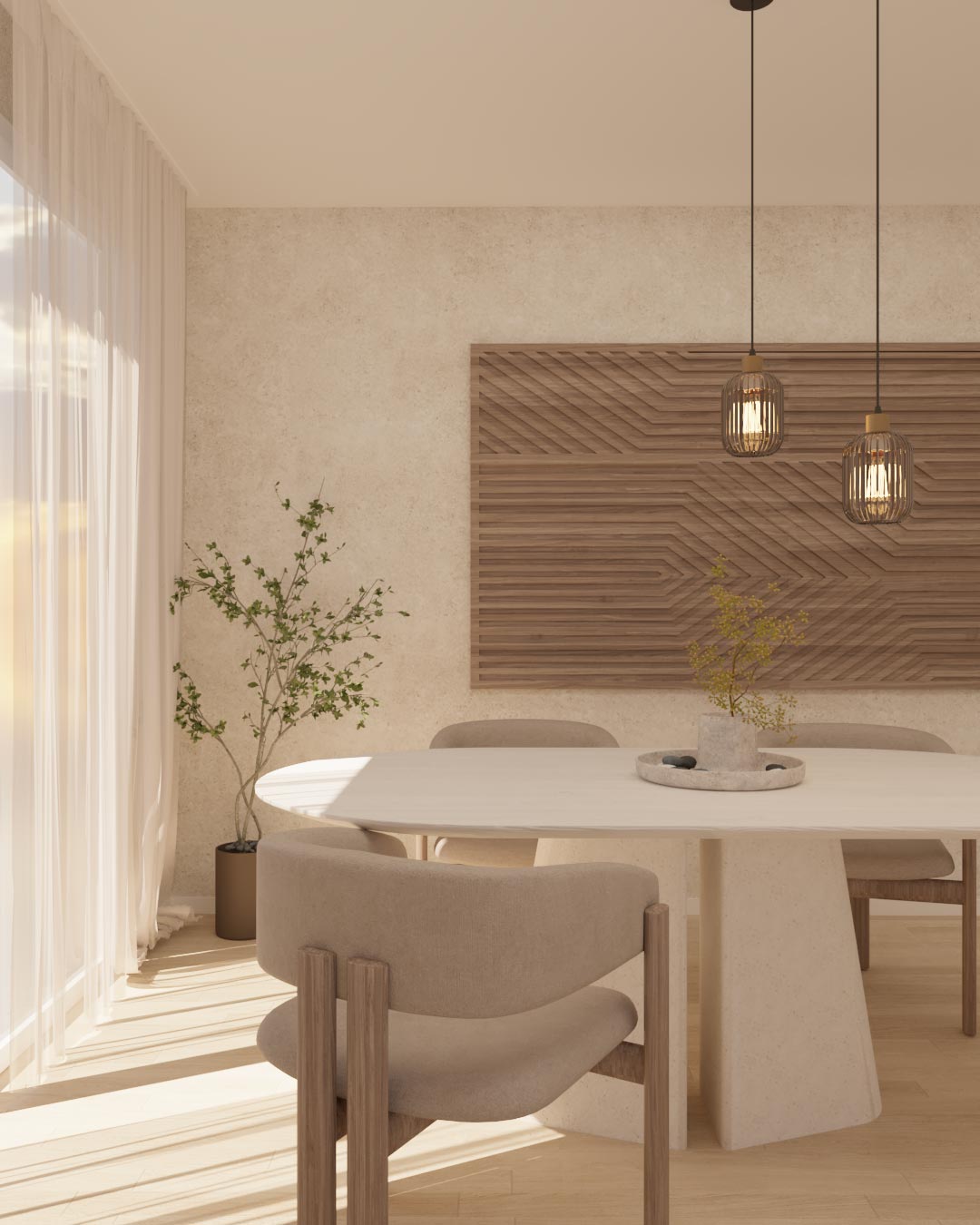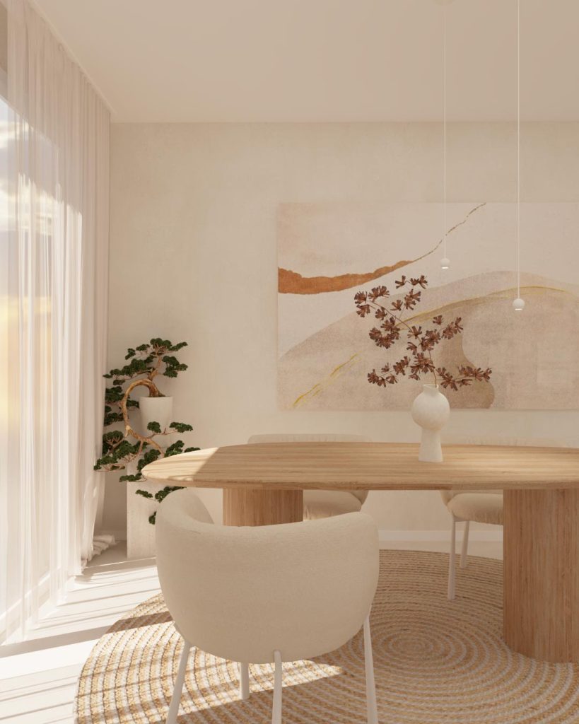 La decorazione è ridotta all’essenziale, ma non trascurata. Pochi elementi, selezionati con accortezza, possono bastare a creare un’atmosfera accogliente e delicata, perfettamente in linea con lo spirito Japandi.
