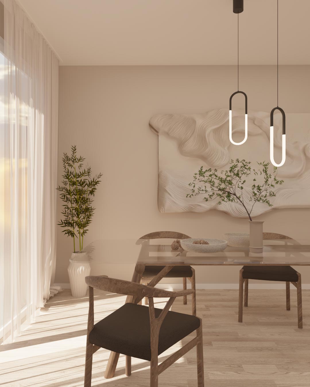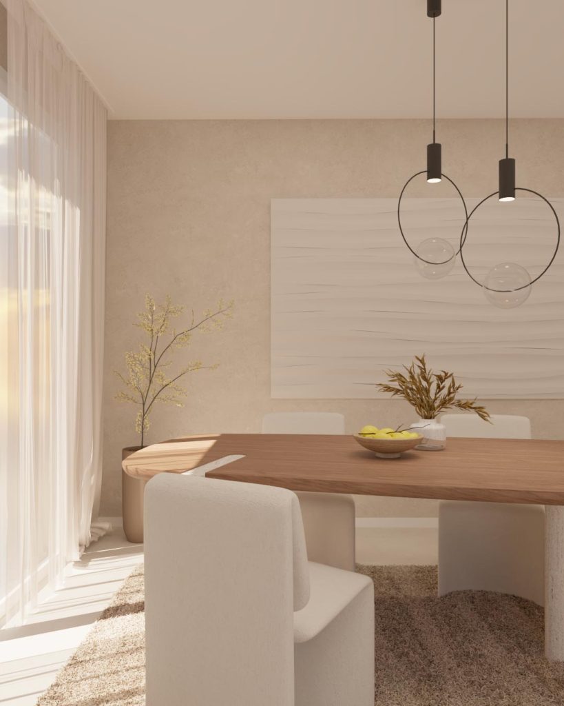 La palette cromatica dello stile Japandi è dominata da toni neutri e rilassanti: beige morbidi, grigi caldi, sfumature di tortora e bianco sporco definiscono la base visiva dello spazio. Queste tonalità, ispirate alla natura, vengono spesso arricchite da contrasti eleganti e avvolgenti come il nero opaco o il marrone cioccolato, che aggiungono carattere e profondità.